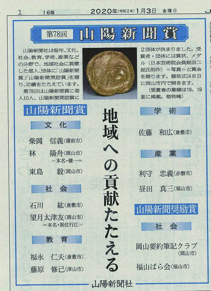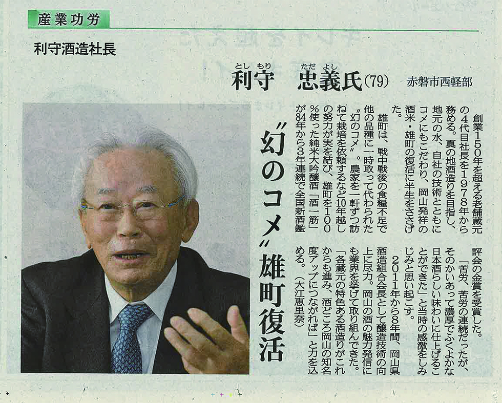 「第78回 山陽新聞賞」受賞 山陽新聞社が毎年、文化、社会、教育、学術、産業などの分野で、地域社会に貢献した個人、団体を表彰。 弊社社長・利守忠義(4代目)が「雄町米」復活の功績により産業功労部門で受賞致しました。