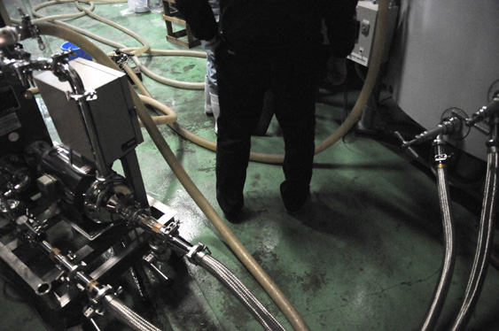 酒一筋 冷却  今朝はサーマルタンク(温度管理の出来るタンク)で お世話になっている新潟の新洋技研さんが開発した サーマルタンク用の冷却システムの試験を行っています。 新酒の火入れ(加熱処理)を行った場合、いかにして早く お酒の温度を下げるかが課題。 現在、酒一筋で行っている方法とこの器械と、どちらが良いか? どの様な違いが出るかを試験中。 以前からこの器械の話は伺っていて、実際に導入された蔵から も評判は聞いていました。しかし、それが酒一筋に合うかどうかは 試してみないと分からない、という事で本日の試験となりました。 同じ器械、道具であっても蔵によって使い勝手がありますから 合う合わないという事は出てきます。 さて、どうなるでしょう。楽しみです。