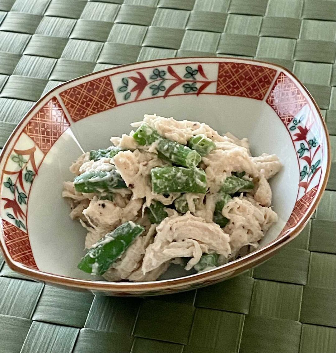 《いんげんと鶏ささみの酒粕クリチー和え》