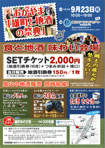 おかやま「雄町と地酒の祭典」 岡山の食と地酒を味わえるお祭りです! どなたでもご参加出来ます。 岡山の地酒をチケットと交換に楽しめ、気に入ったお酒は購入する事も出来ます。 (チケット1枚:150円、お酒の種類によってチケットの必要枚数が異なります) (お酒の有料試飲、販売は二十歳以上)