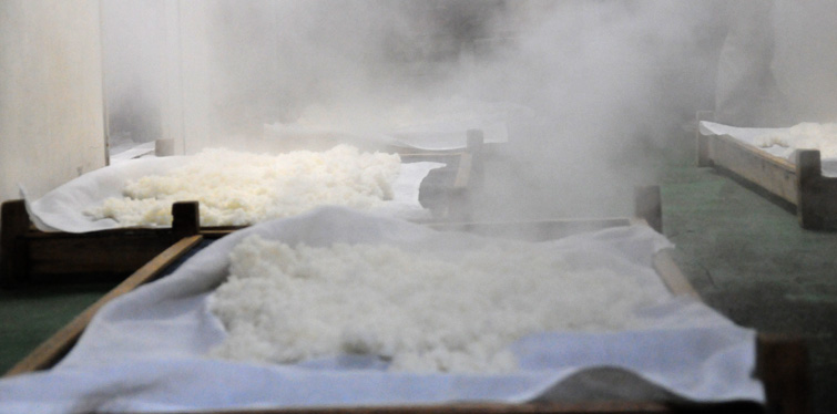 雄町蒸米 ここ数日で気温がぐっと下がりました。 ありがたい事です! 今年最後の雄町の蒸しになります。 外気が低いので窯の蓋を開けると真っ白な湯気 が立ち上ります。 (正に寒仕込みと言う感じです) 会社も蔵も31日(大晦日)まで仕事をしております。 (蔵人は明日早目に但馬に一時帰宅致します) 残り二日間頑張っていきますよ! 雄町米の蒸し 雄町の蒸しを取って広げるとそこら辺りが真っ白、 前が曇って見えなくなるほどです。 この蒸米を広げる作業、だんだんと慣れてはきますが 手が熱い。炊きあがったご飯でおにぎりを握るのと同 じ様な感じですかね。 何故かこの作業を行った後の手はいつもすべすべ 状態です。これもお米の力なんでしょうか!