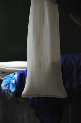 醪(もろみ)を粕袋に入れて槽の中に並べていきます。