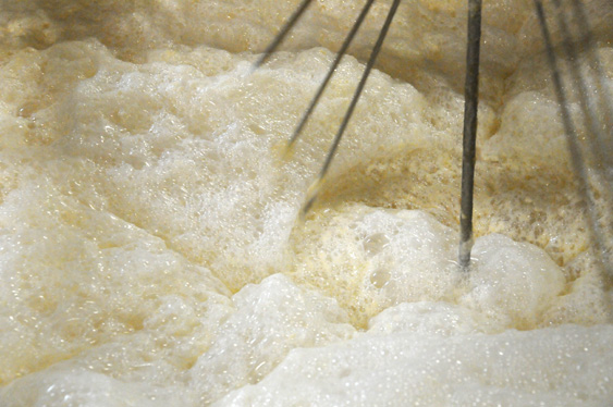 泡だてている訳ではありません、泡を消しています! 近年は泡なし酵母が主流で、この様な昔ながらの泡あり酵母 は珍しいかもしれません。 泡ありだと発酵の際に出る泡を消してやる必要があります。 泡消しと呼ばれる(扇風機のように回転する装置)ものを設置 します。これを忘れるとタンクから溢れ驚く事態に。 本日も蔵の中は発酵中!