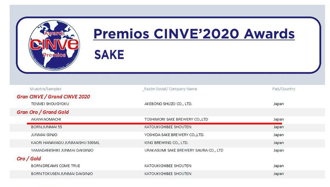 「赤磐雄町 純米大吟醸」が”Gran oro/Grand Gold” に輝きました!
