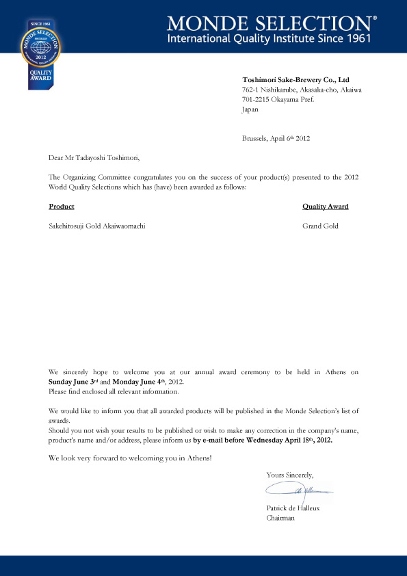 2012年モンドセレクション(MONDE SELECTION)Grand Gold(最高金賞)