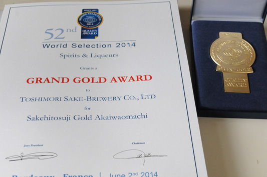 この荷物はもしかして・・・・ 表彰式に参加出来ない人には送ってきてくれます。 (今年の表彰式はボルドーで行われたようです) 一度は参加してみたいと思いながら、未だに叶っておりません。 届きました「モンドセレクション2014 最高金賞」の賞状とメダル。 これを励みに今季の米作り・酒造りもがんばります!