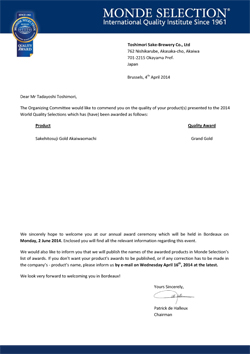 「2014年モンドセレクション Grand Gold(最高金賞)受賞」