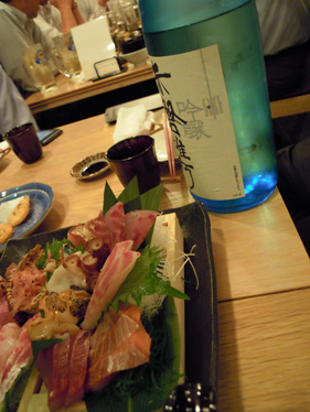 さんに吟醸新酒 祭の後に伺ってきました。 当日は宴会が多く店内のテーブル席は、ほぼ満席 状態。(大人数の場合は予約を!) 四ツ谷のちょっとした穴場かもしれません。 他の魚真さんと同じく新鮮な魚と日本酒を楽しめます。 本日のおススメに合わせて頂いたのは「赤磐雄町 吟醸生」、 魚(肴)とよく合います。 楽しい仲間と、美味しい組み合わせについつい飲み過ぎて しまった夜でした。