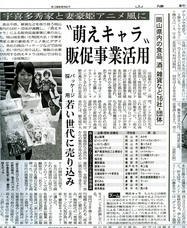 先日スタートした「HIDE&GOH」企画が 山陽新聞(9月15日)地方経済で紹介されました。 岡山県内の食品、雑貨など16社・団体が連携し 「萌キャラ」による販売促進事業に乗り出しました。 酒一筋では瀬戸内の国産檸檬を丸ごと使用してつくった 「