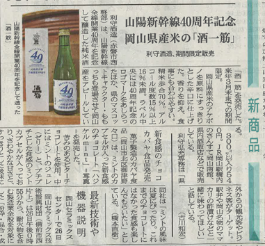 山陽新聞(2015.6.17)「地方経済」に先日発売開始した 「酒一筋・山陽新幹線40周年記念純米酒」が掲載されました。