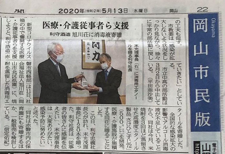 山陽新聞(2020/5/13) 社会福祉法人旭川荘への消毒用エタノール「さけひとすじ72」寄付の記事を掲載頂きました。