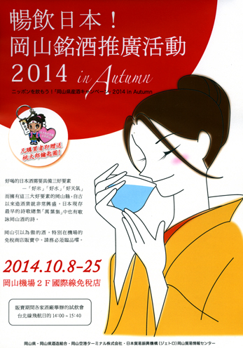 岡山県産酒フェア 2014・10・8~25 岡山空港国際線免税店で開催中! 外国から岡山を訪れる方を対象とした、岡山地酒のPRを 10月8~25日の間、岡山ー台北便に合わせて開催。