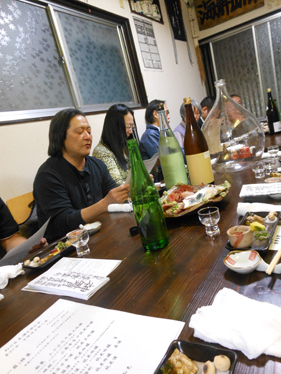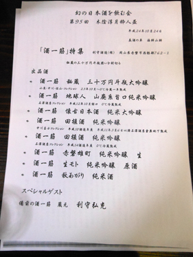 幻の日本酒を飲む会・「第95回 木陰浮月粋人盃」 「酒一筋」特集に参加させて頂きました。 今回の会は昨年当社から送った(ご購入頂いた)斗びん・大吟醸が 冷蔵庫で一年経った事をうけて開催されました。 メインの斗びんの他にも酒一筋・雄町米栽培体験に参加した人だけが 購入できる田植酒(平成10年、平成14年)、すでに終売となっている 山廃純米吟醸の「地球人」と・・・・嬉しい驚きのラインナップ。 お酒はすべて冷から常温、お燗と色々な温度帯で海鮮山鮮の料理と 合わせて楽しみました。 みなさんいかがだったでしょうか? 冷蔵庫で貯蔵して下さった石澤さん、田植酒のコレクションを提供 してくれた中川さんに感謝。 ご参加下さった皆さんありがとうございました、ご自宅でも貯蔵熟成 をお楽しみください。