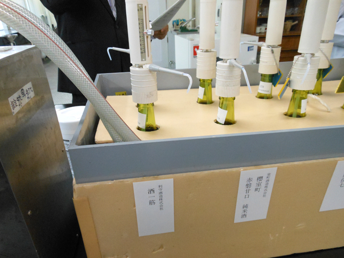 (恒温器に酒瓶が浸かっていて一定の温度が保たれています)