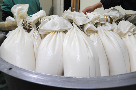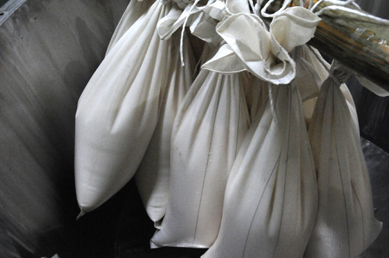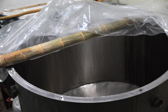 先日行った「首吊り」と呼ばれる搾り方です。 醪の入った粕袋を竹の棒に吊るし、自然にお酒が垂れてくるのを待ちます。 これを下で「斗びん」と呼ばれる18Lの容器で受けたものが「斗びん取り」。 (手間と時間が掛るためこれぞと言う大吟醸のみ「首吊り」で搾ります。) 斗びんに取ったものはじっくりと味がのるのを待ちます。