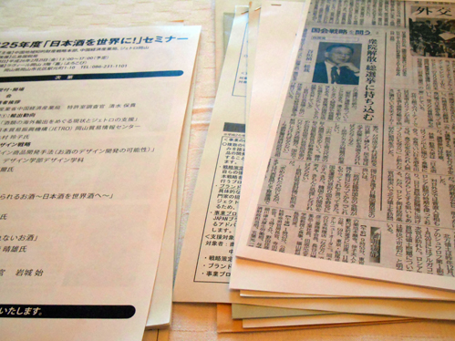 講演者にJETRO岡山・木村所長、岡山県立大学・村木准教授、コーポ・サチの平出氏、日本酒ジャーナリスト・松崎氏と豪華メンバーによるセミナーでした。