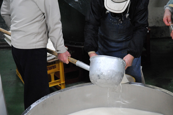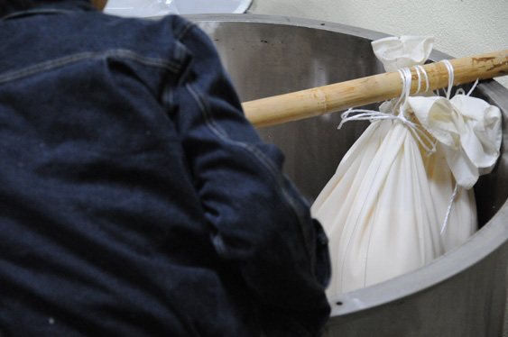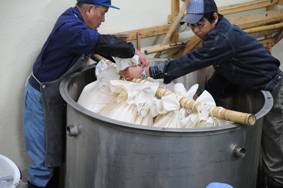 大吟醸の醪(もろみ)を粕袋と呼ばれる白い布の中に入れ、醪の