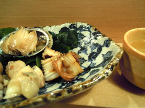 さんにお邪魔して来ました。 中目黒の駅からちょっと離れていますが、着いてみれば お店は満席。(みなさん美味しいお店はよくご存じですね・・) 毎回、旬の魚で楽しませてくれる魚哲。 今夜は煮貝の盛り合わせで一杯、貝好きにはたまらない 酒の肴ですね。 酒は勿論、「