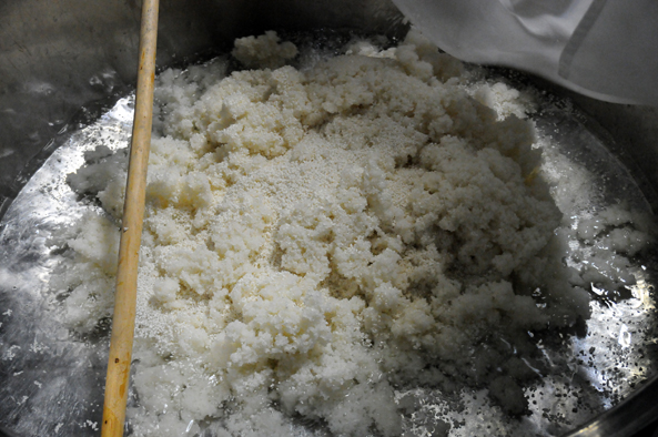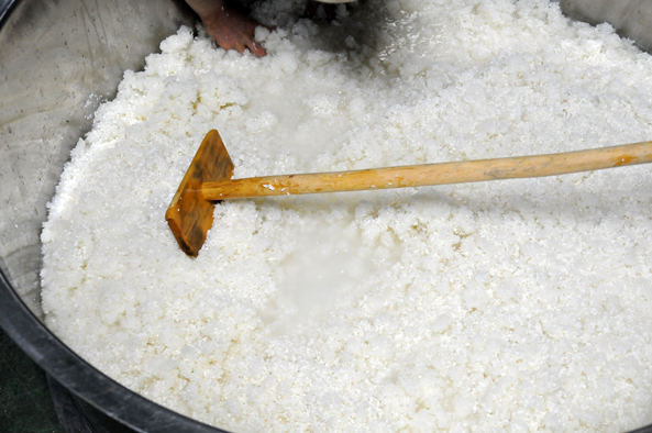 水を張った半切りの中に蒸米と麹を入れていきます。
