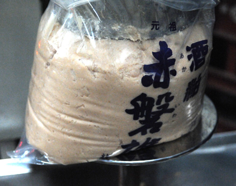 【留粕】 とめかす  酒粕は貯蔵する間に軟らかくなるのでこれを漬物用に使用し ます。貯蔵温度が高い方が早く軟らかくなりますが、カビが生え たり、また乾燥して使用出来なくなってしまいます。 冬(仕込時期)に出来た酒粕を桶あるいはタンクに入れて足で 踏み込み、空気を追い出して密封して貯蔵します。 踏み込んで貯蔵する事から「踏込粕」とも言われます。 良い酒を搾った後の酒粕を貯蔵した物は、同じ漬物用として使 用した場合、出来上がりの味が一味も二味も違ってきます。
