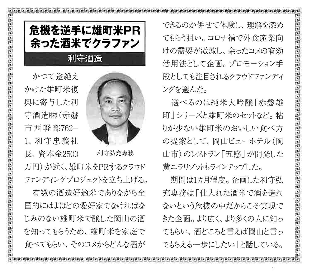 VISION OKAYAMA No.21202(06.22/29) 瀬戸内経済レポート 酒米「雄町米」のクラウドファンディングでの取組をご紹介頂きました。
