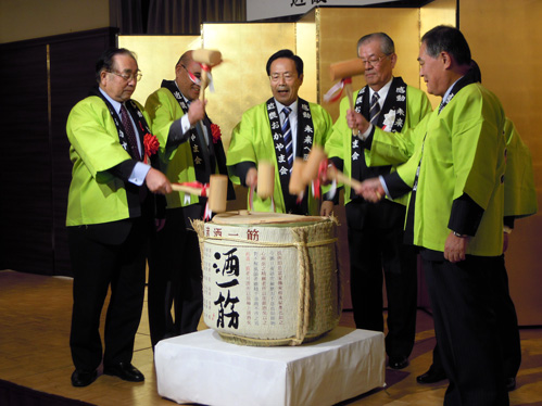今年も「せ~の」掛け声とともに「酒一筋菰樽」の鏡開