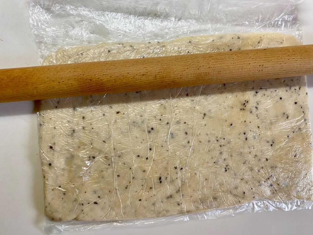 ②①の生地を麺棒で約3㎜程に薄く伸ばし広げ、冷蔵庫に30分休ませる。