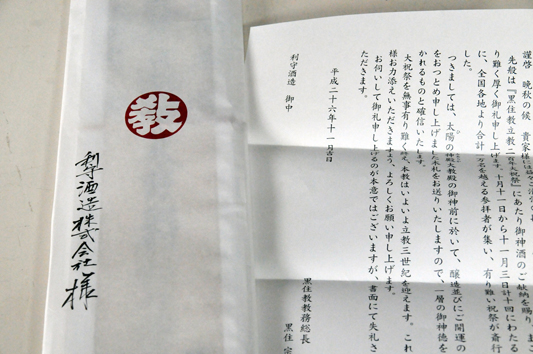 今年、立教二百年を迎えた黒住教より 醸造、開運祈願のお札を頂戴しました。 ありがとうございます。 今季も良い酒が醸せるようにがんばります! 間もなく蔵で一番早い新酒「