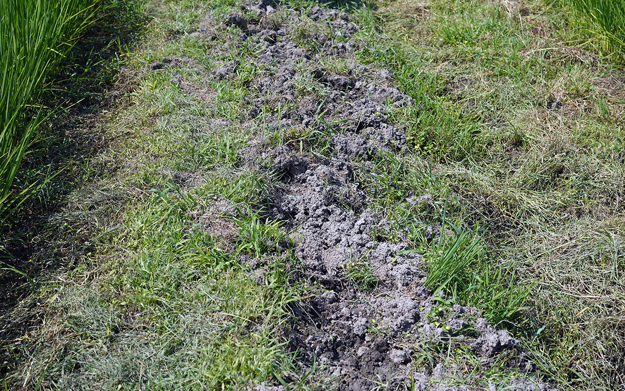 酒米「雄町」を復活した利守酒造は自社栽培も行っています。 雄町の自社田に猪襲来です。 畦を掘り返して、畦が壊れてしまいます。 田の周りに電線を引いておりますが、何処からか入ってきます。 さあ知恵比べ!
