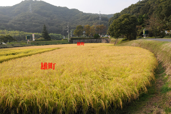 綺麗ですね! 収穫を待つ雄町の田です。 「雄町」と表示していないのがご近所の田 (米の品種は分かりませんが飯米) 見た目にも違いが分かると思います。  毎年恒例の収穫祭ですが、今年はどうもお天気がアヤシイ・・・ もしかすると雨天中止になるかもしれません。 明日(14日AM)には開催の有無をお知らせしたいと思います。 ご迷惑をお掛け致しますがよろしくお願いします。 お天気にはは勝てません・・・・・。