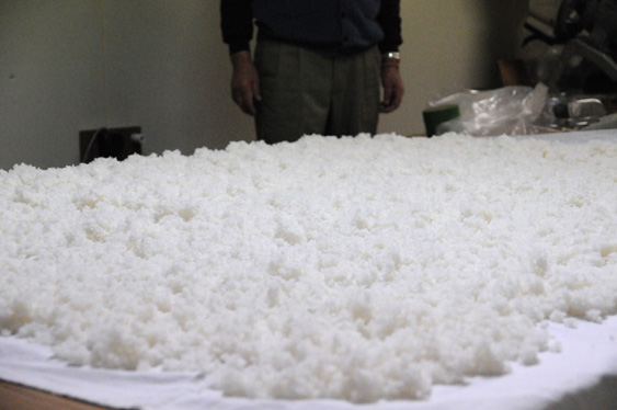 蒸した米(雄町)にもやしと呼ばれる菌をふって麹を作る