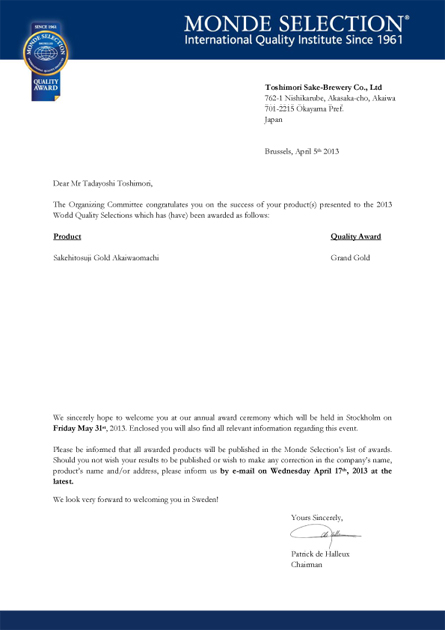 2013年モンドセレクション(MONDE SELECTION)Grand Gold(最高金賞) 受賞 です。 荷物が税関でとまってしまったりと色々とトラブルはありましたが 2013年も最高金賞(グランドゴールド)受賞する事が出来ました。 出品酒が届かないと連絡があった時には冷や汗が流れましたが、 これで一安心です。 ありがとうございます!