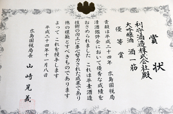 「香を主たる特徴とする清酒」部門 “酒一筋 大吟醸” 優等賞 受賞