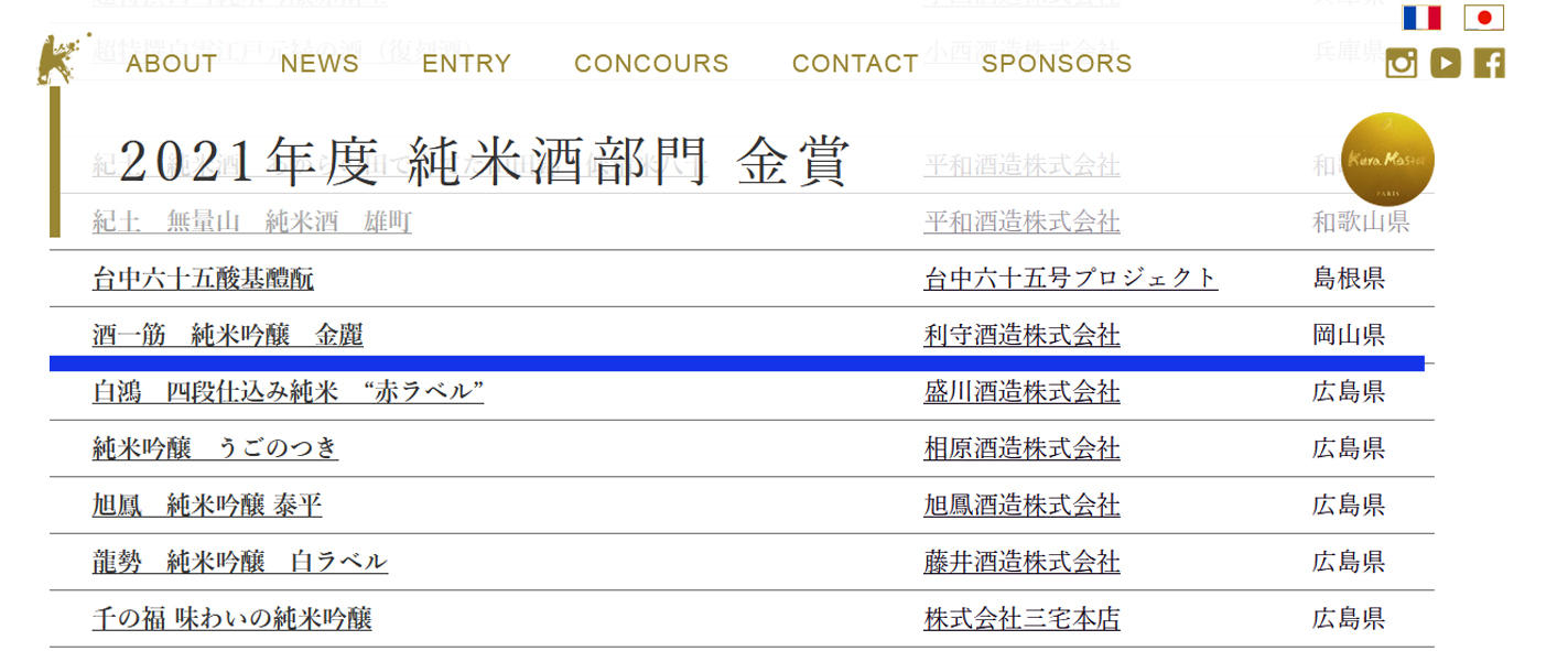 毎年フランスで開催される日本酒コンテスト「Kuramaster」において2021年もGold(金賞)を受賞致しました。 「
